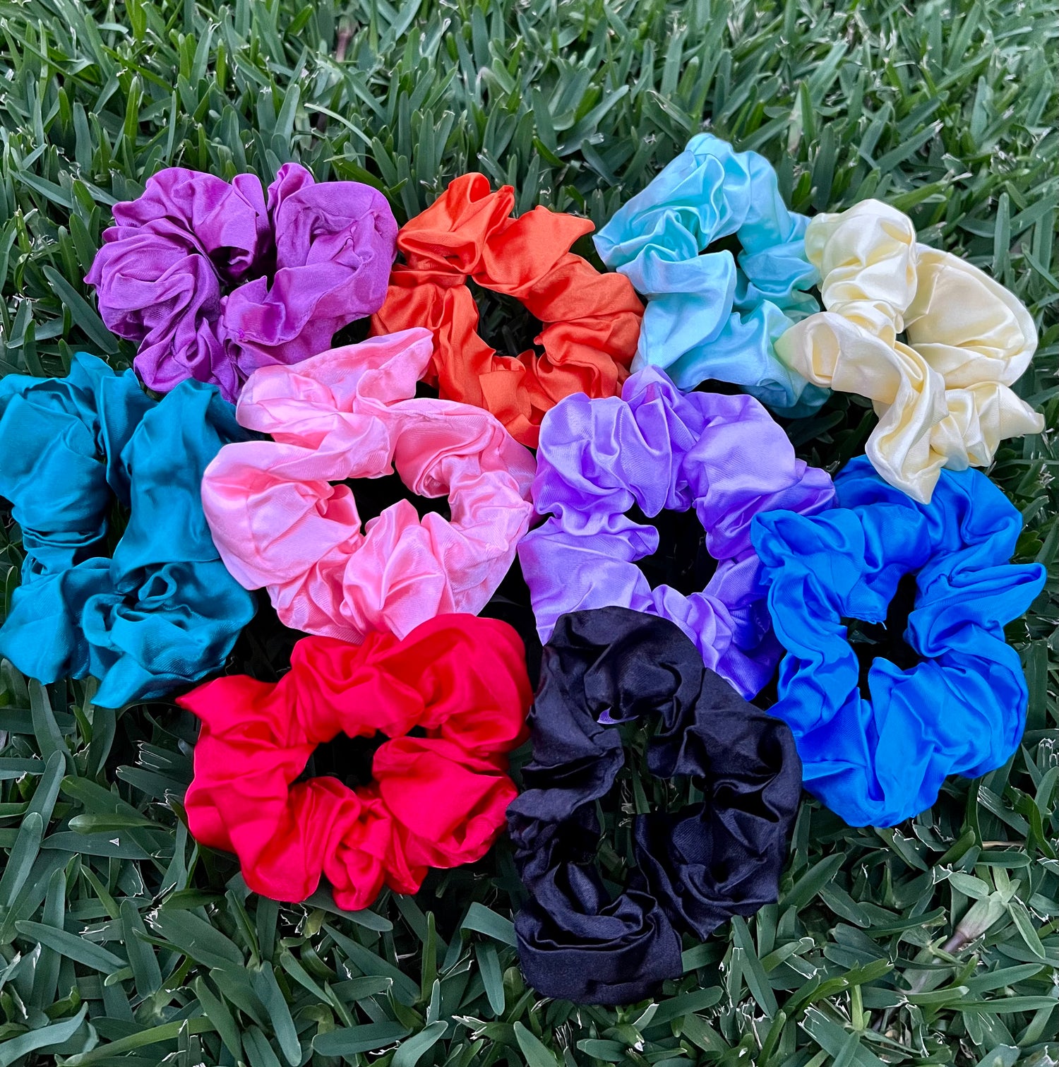 Our scrunchie collection features an emerald, purple, orange, blush, red, black, lavender,...